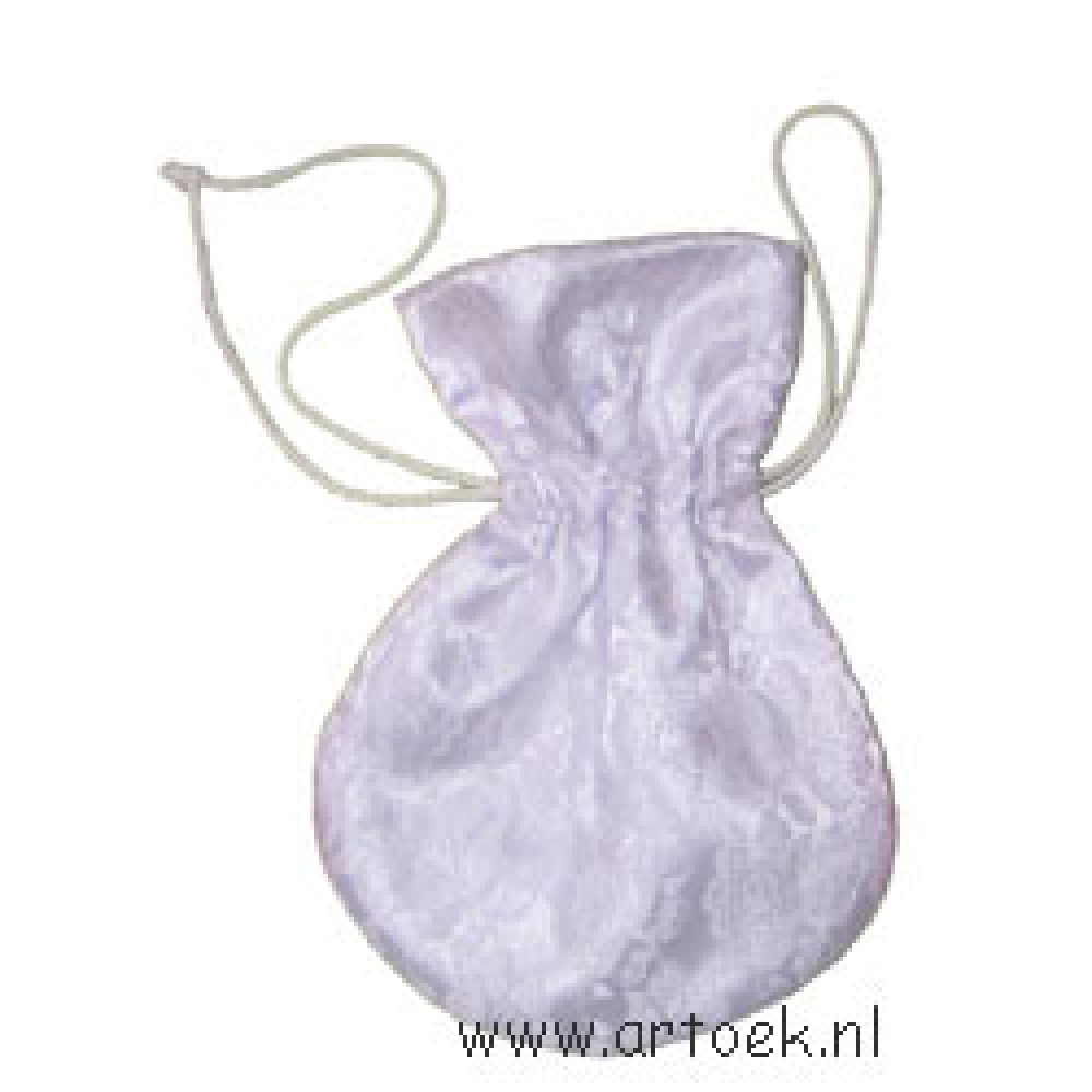 Stoffen tasje van witte satijn met witte kant (van dezelfde stof als de trouwjurk). Wordt gesloten door aan de koordjes te trekken.