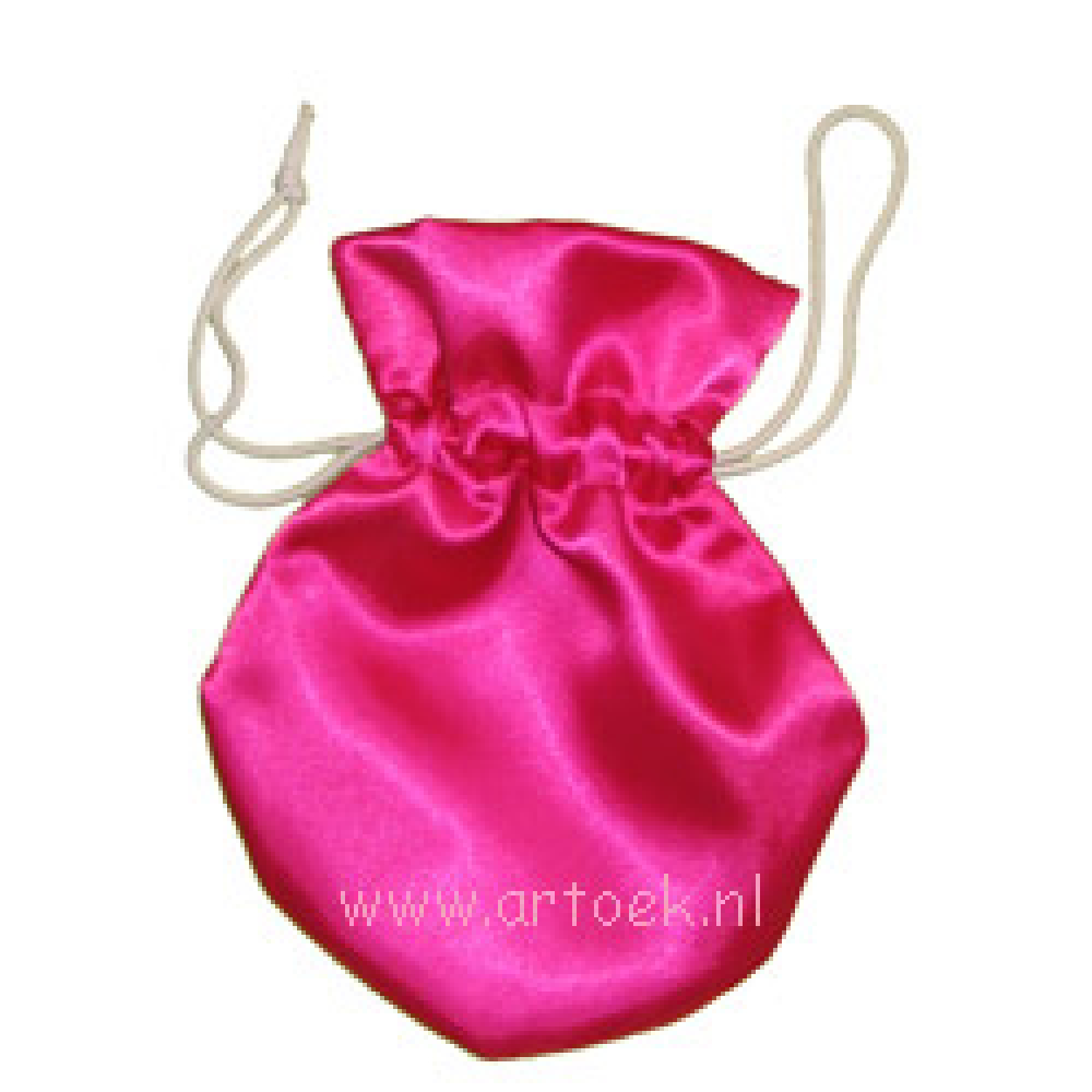 Buideltasje/knikkerzak van rose satijn. Wordt gesloten door aan de koordjes te trekken.