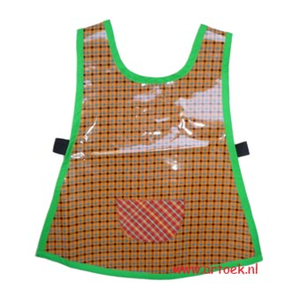 Plastic pippi-schortje afgewerkt met katoenen bies en zakje. Lengte circa 45 cm.