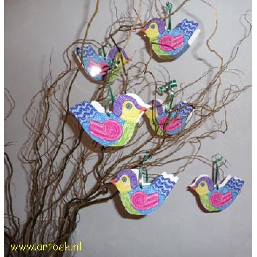 Maat; Een in elkaar geknutseld vogeltje is 13,5 bij 8,5 cm, dikte 3,5 cm