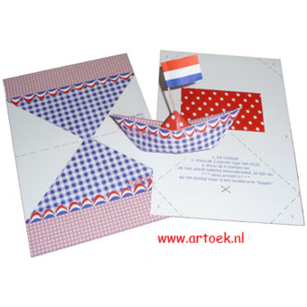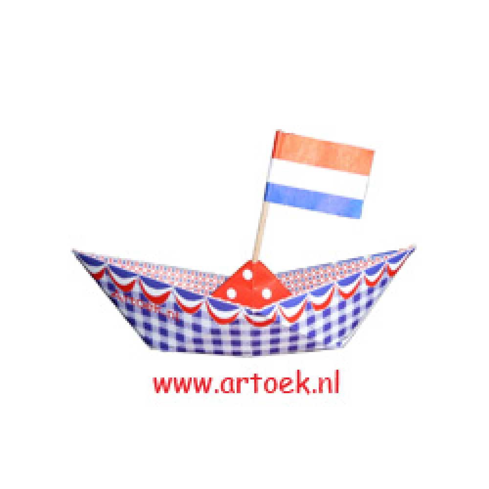Bouwplaatje in de kleuren rood-wit-blauw om een papieren bootje te vouwen. Traktatiebootje kan gevuld worden met tumtummetjes, rozijnen of nootjes. Wordt geleverd zonder vlaggetje. Op het vlaggetje is ruimte om een naam en/of leeftijd te schrijven.
