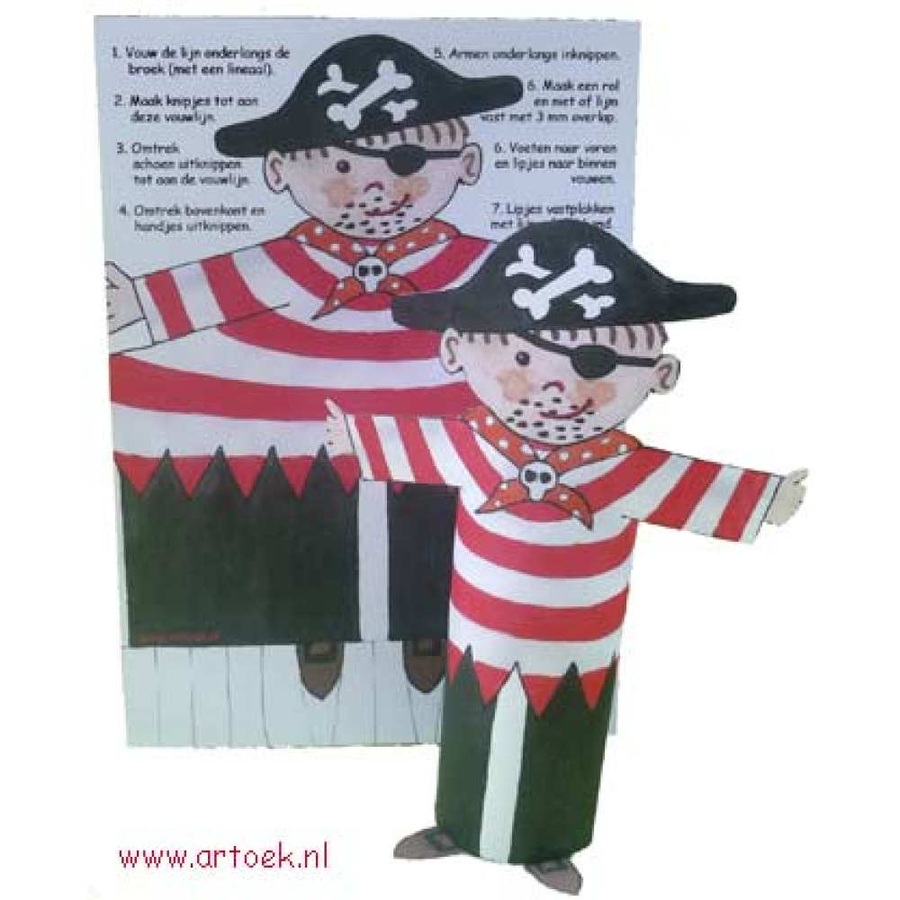 Maat; Bouwplaat is A5, de grootte van de rol komt ongeveer overeen met een WC-rolletje. Hoogte piraat circa 17 cm.